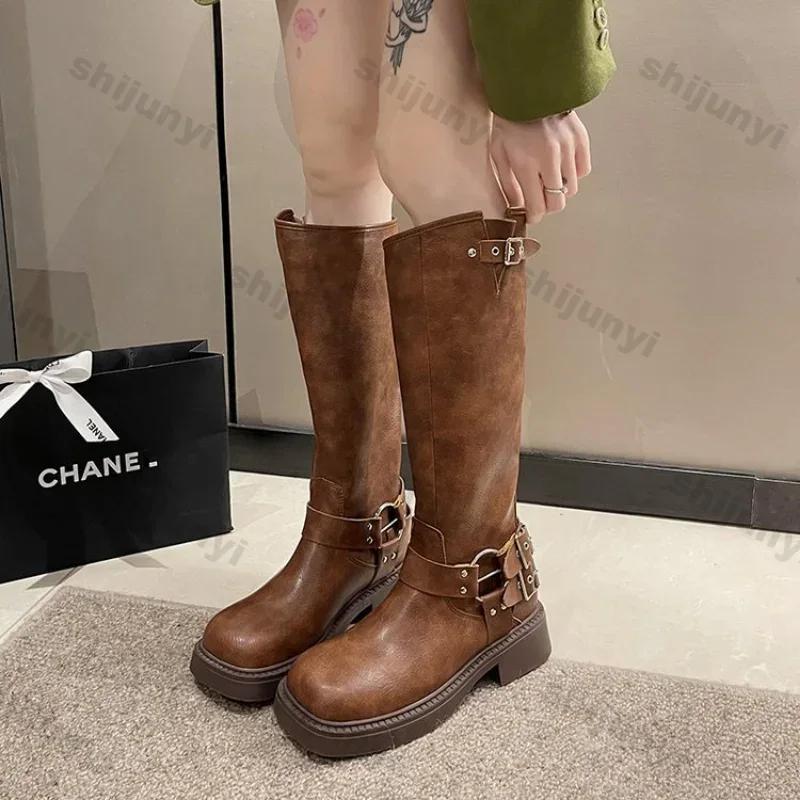 Модные женские сапоги на платформе с высоким рыцарским каблуком и пряжкой, женские винтажные модные повседневные роскошные дизайнерские ковбойские сапоги в стиле вестерн до середины голени