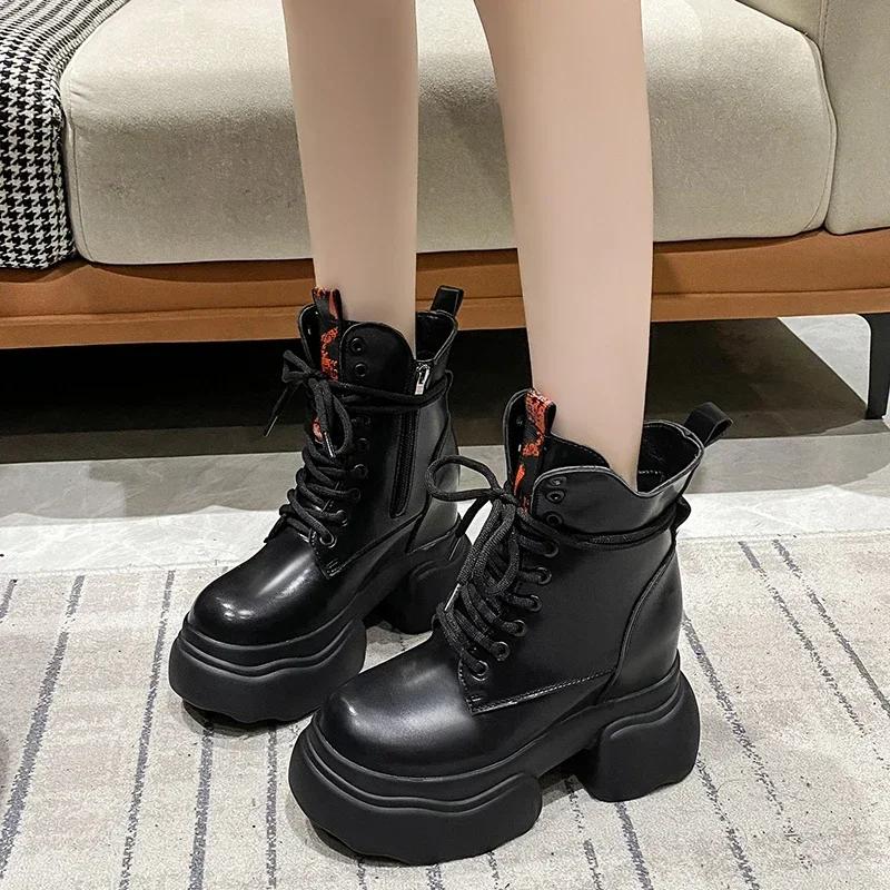 Модные женские ботильоны 11 см на платформе, кроссовки на высоком каблуке, кожаные толстые ботинки, новые осенне-зимние мотоциклетные ботинки со шнуровкой Botas Mujer — купить товар онлайн с бесплатной доставкой по всему миру!