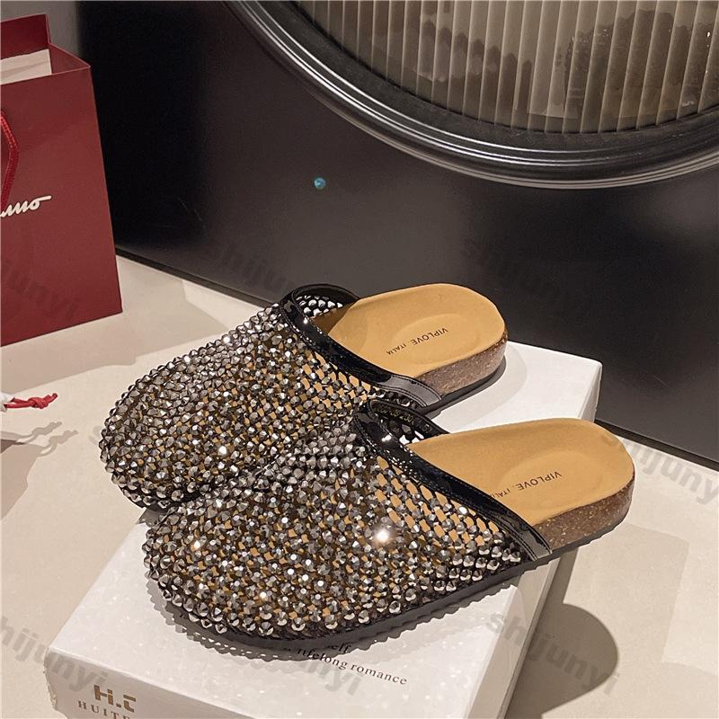 Модные женские сандалии со стразами 2025 Лето Дышащие Легкие Удобные Шлепанцы Модные Нескользящие Уличные Повседневные Балетки