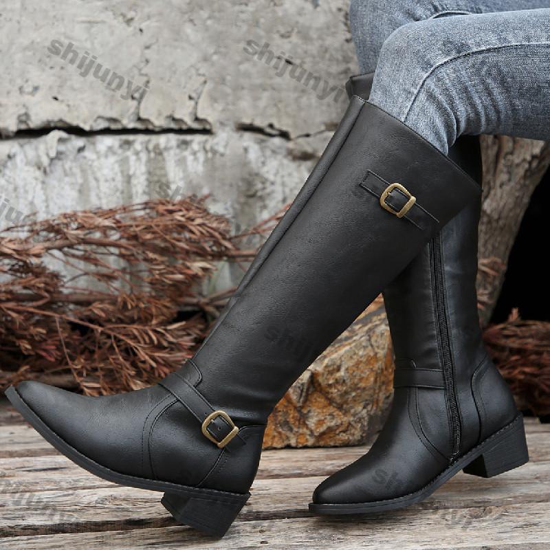 Модные женские длинные сапоги на толстом каблуке Осень Зима Кожа PU Сапоги до середины икры Женские модные сапоги с ремешком с пряжкой на молнии сбоку Мотоциклетные сапоги