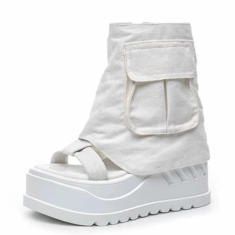 Мода 10СМ Мода Холст Весна Лето Платформа Танкетка Балетки Сандалии Женщины Осень Британский Мотоциклетный Мода Молния Ботильоны Обувь
