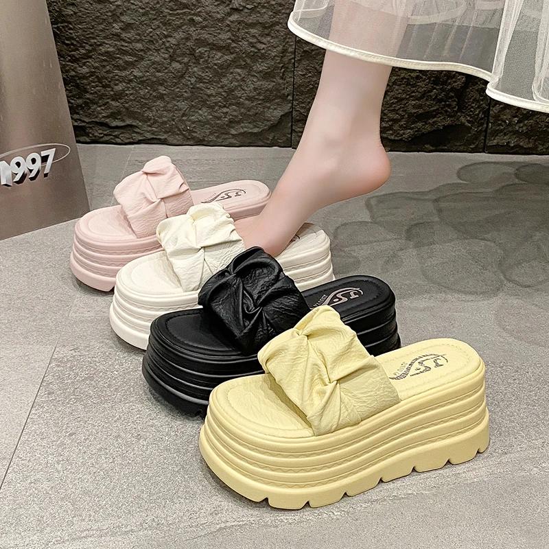 Модные 8 см Летние женские тапочки Новые плиссированные Толстая подошва Папины кроссовки Повседневные Слайды на высокой платформе Домашние Шлепанцы Кроссовки Женские