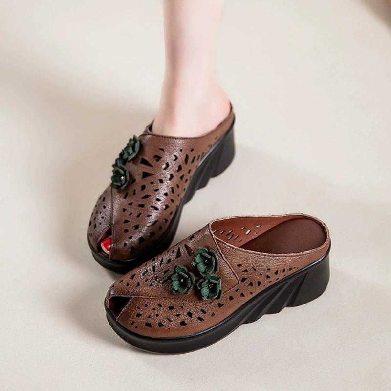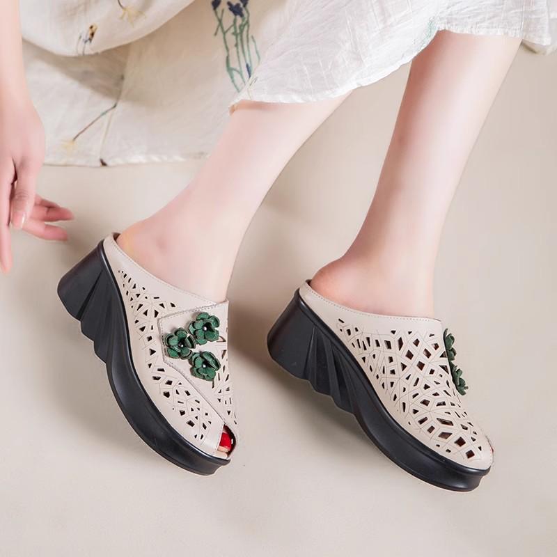 Мода GKTINOO Цветы Полые Женские Туфли Мамины Тапочки Летние С Открытым Носком Клинья Сандалии Натуральная Кожа Женские Шлепанцы Обувь на Платформе Женщина