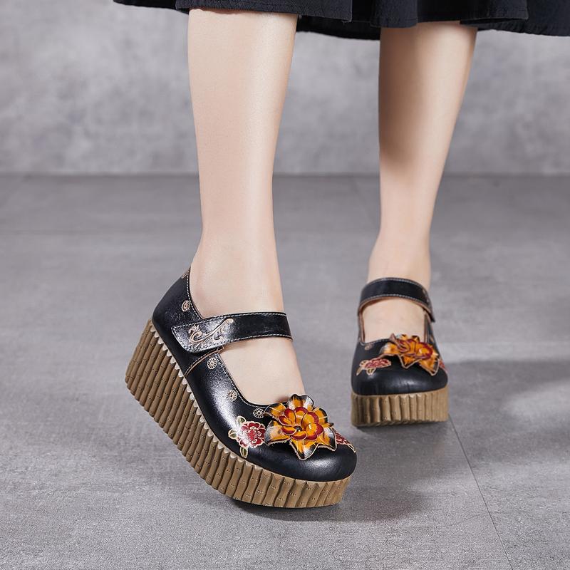 Модные туфли-лодочки GKTINOO в стиле ретро, женская обувь из натуральной кожи на липучке, новая весна 2025, круглый носок, цветочный принт, ручная работа, лаконичные туфли на платформе