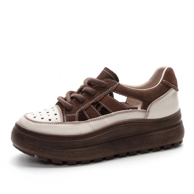 Модная летняя женская обувь 2025 Смешанные цвета Натуральная кожа Дышащая Перфорированная Массивная платформа На шнуровке Женские повседневные кроссовки