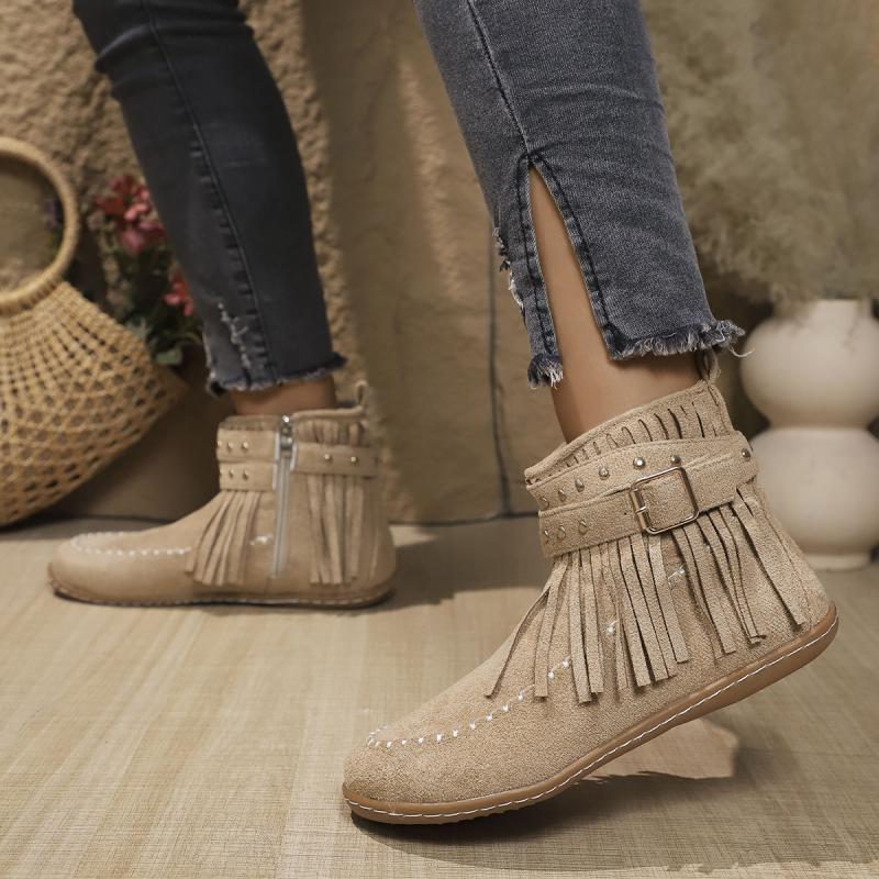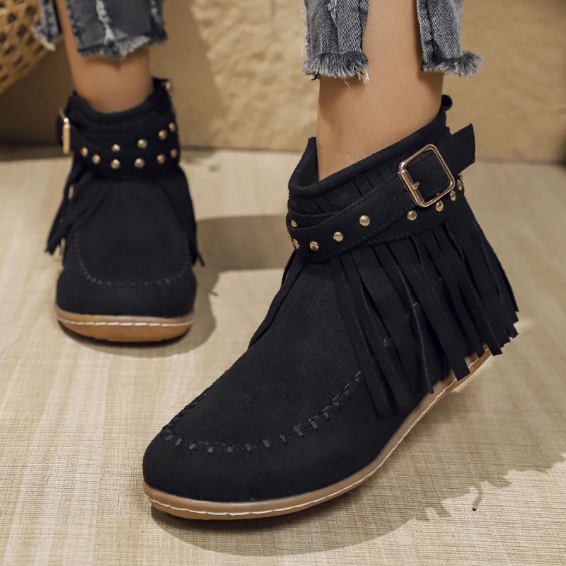 Модные богемные ботинки с бахромой, металлическими заклепками и пряжкой, женские зимние замшевые ботильоны на плоской подошве, модная обувь с боковой молнией