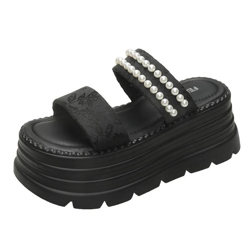 Модные женские сандалии на массивной платформе с ремешком из жемчуга, летние розовые шлепанцы на танкетке с толстой подошвой, женская модная обувь на платформе со шнуровкой