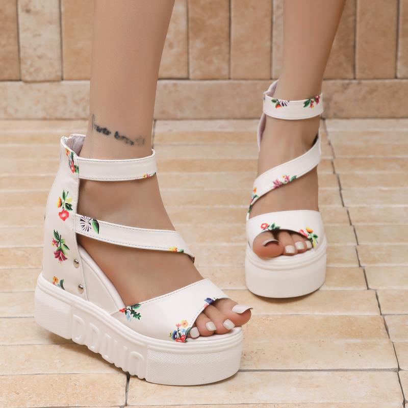 Модные женские сандалии на танкетке с ремешком на щиколотке с принтом роз, лето 2025, сандалии на массивной платформе с задней молнией, модная обувь на супервысоком каблуке