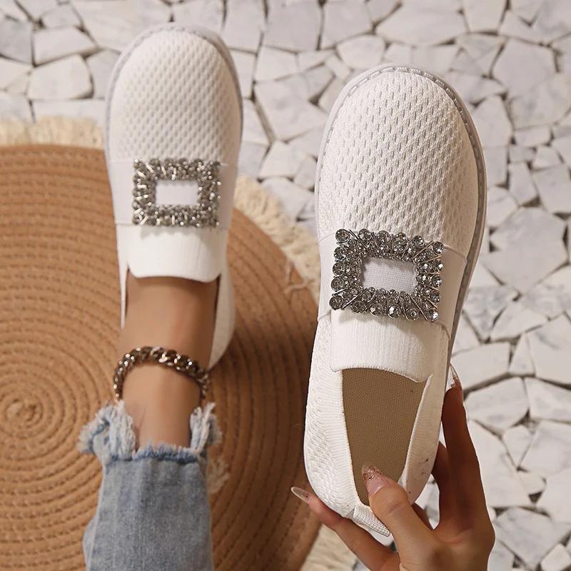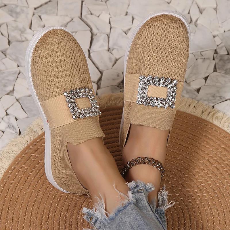 Модные вязаные лоферы-сетка со стразами для женщин, дышащие слипоны, повседневные балетки, женские, осень 2025, обувь для ходьбы на мягкой подошве для дам