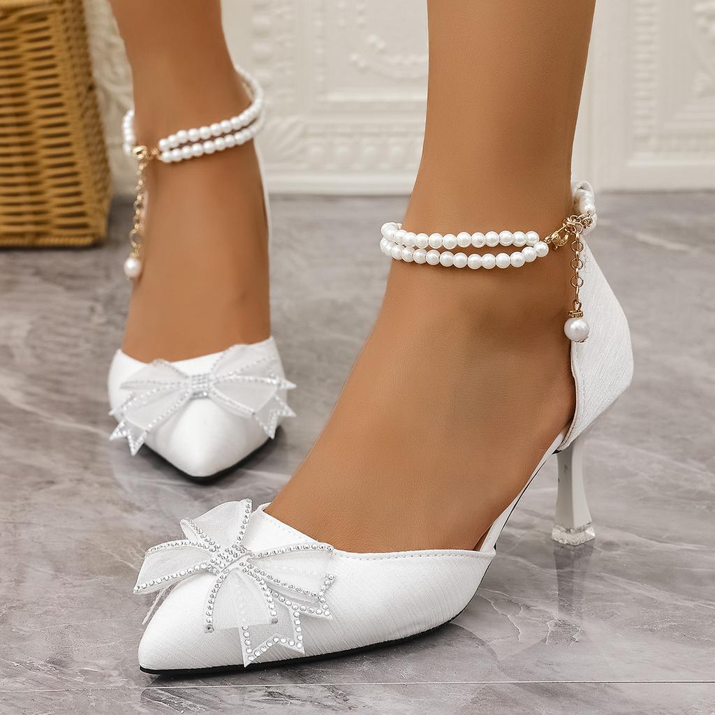 Модные Элегантные Туфли-лодочки с Жемчужной Цепочкой на Щиколотке для Женщин Летние с Бантом Декоративные Остроносые на Высоком Каблуке Модные Белые Свадебные Туфли