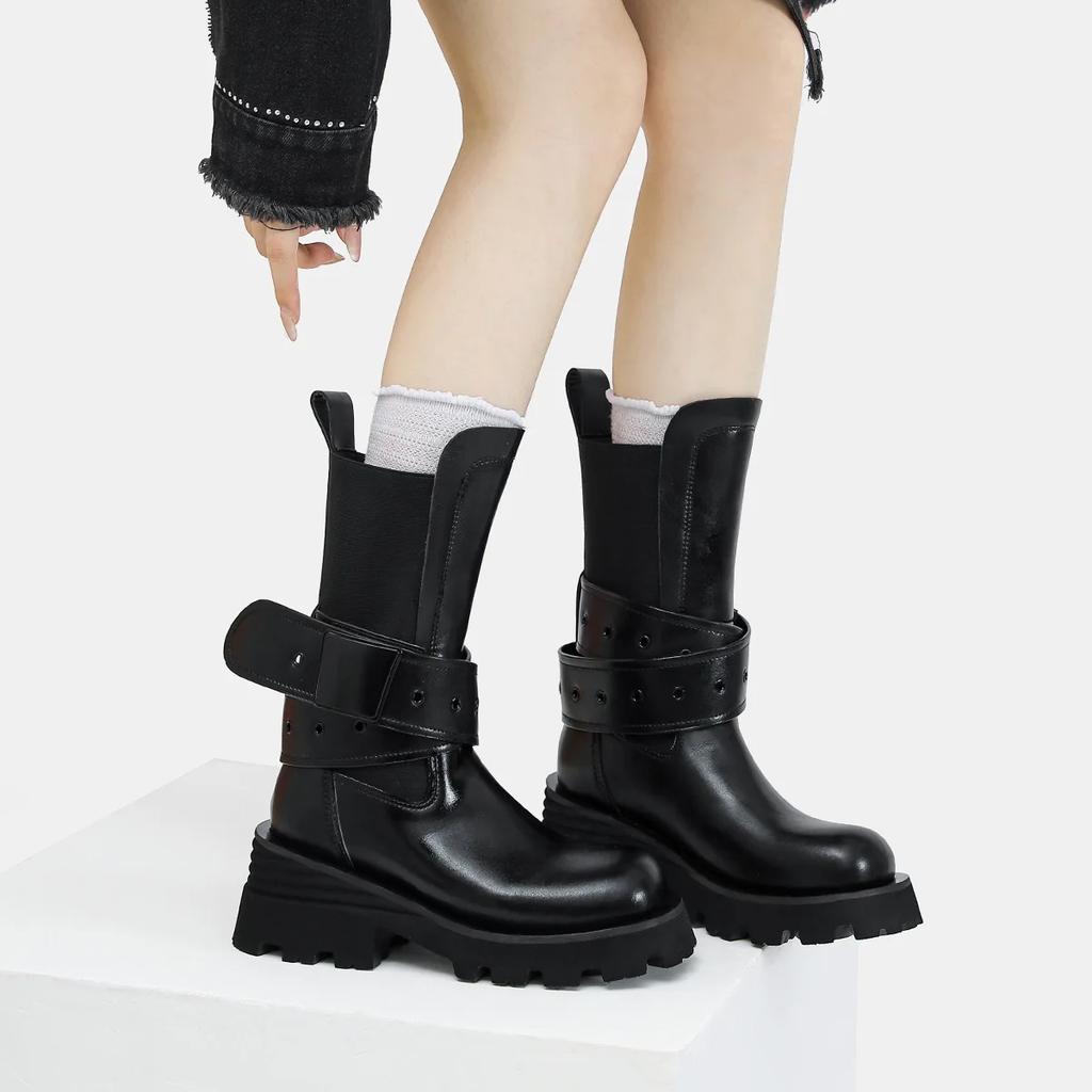 Модные туфли на платформе и среднем каблуке Женские высокие ботинки Обувь Женская Тренд 2025 Зимние сапоги до середины икры Туфли-лодочки Готическое платье Mujer Zapatos Botas