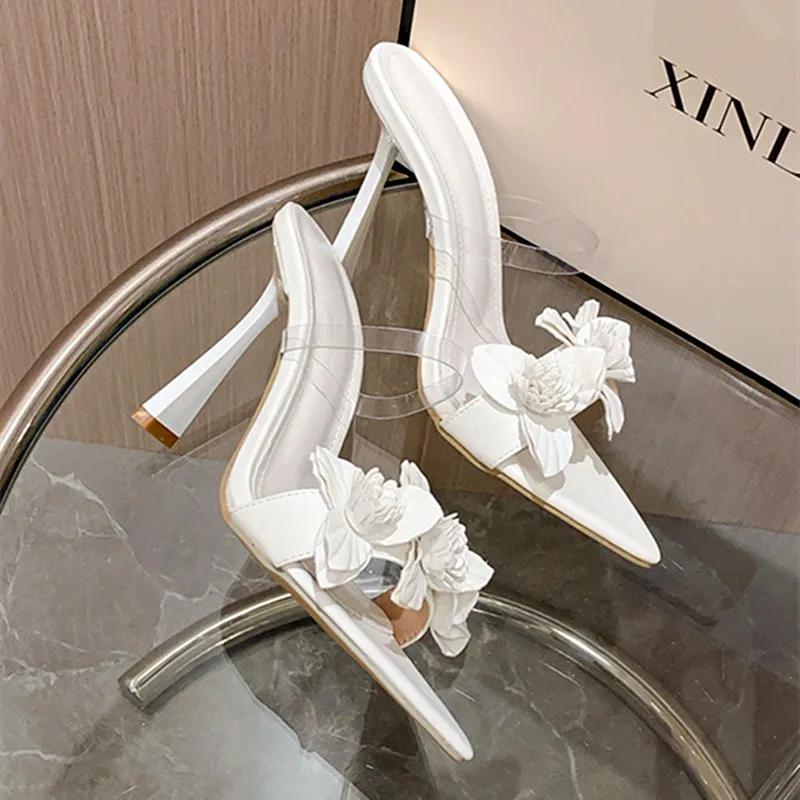 Модный роскошный дизайн золотой цветок тонкий каблук шлепанцы женские сексуальные острый носок ПВХ прозрачный узкий ремешок босоножки на каблуке летние шлепанцы каблуки