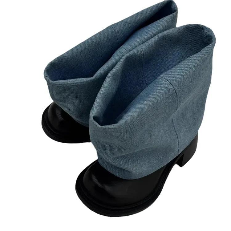 Мода Модные Черные Синие Джинсовые Шорты Брюки Ботинки Новые Толстая Подошва Ретро Круглый Носок Толстый Каблук Морщинистые Ленивые Ботильоны Размер 43