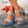 Модные босоножки на высоком толстом каблуке, летние новинки, с круглым носком, открытым носком, жемчужным цветком, из денима, водонепроницаемые, на платформе, римские женские туфли