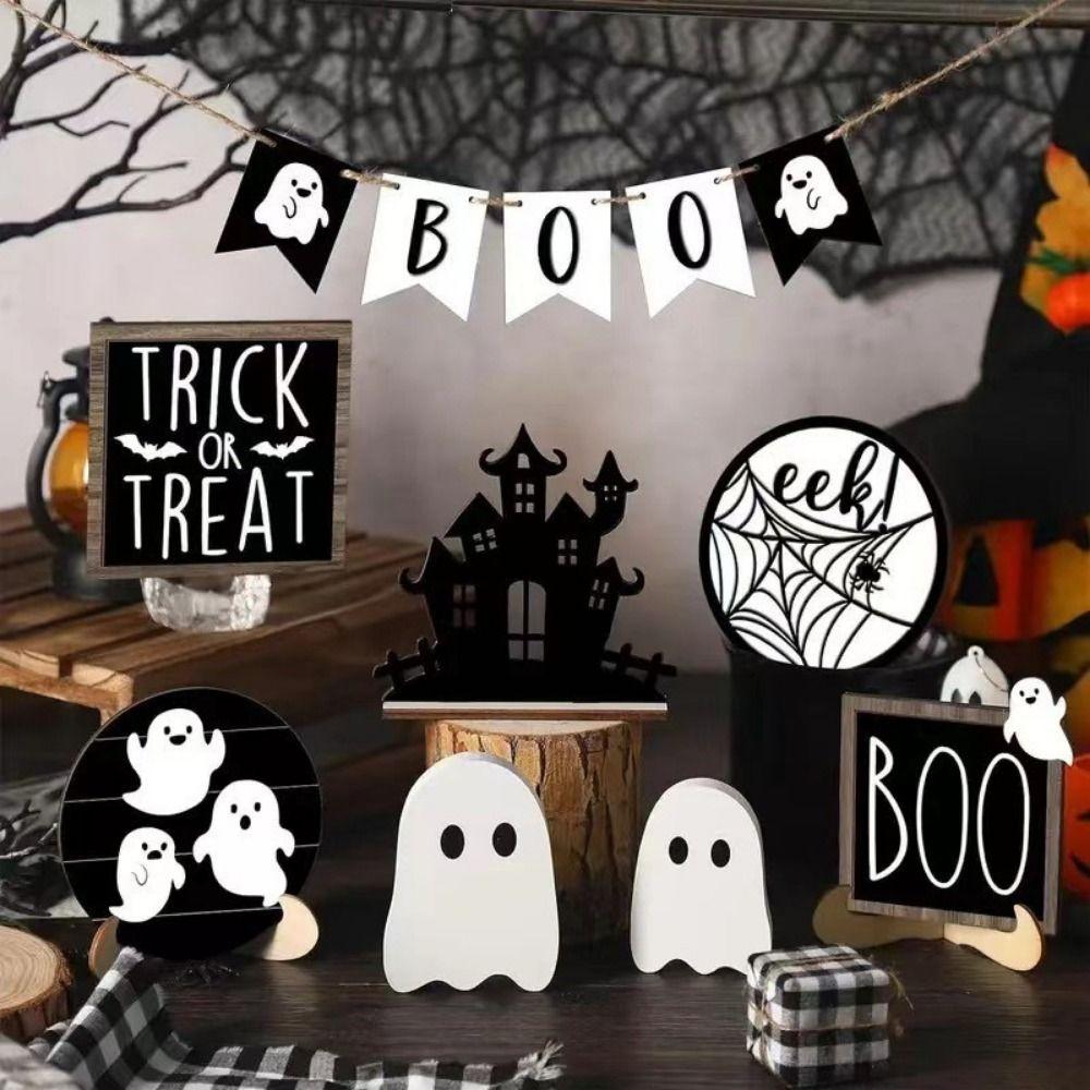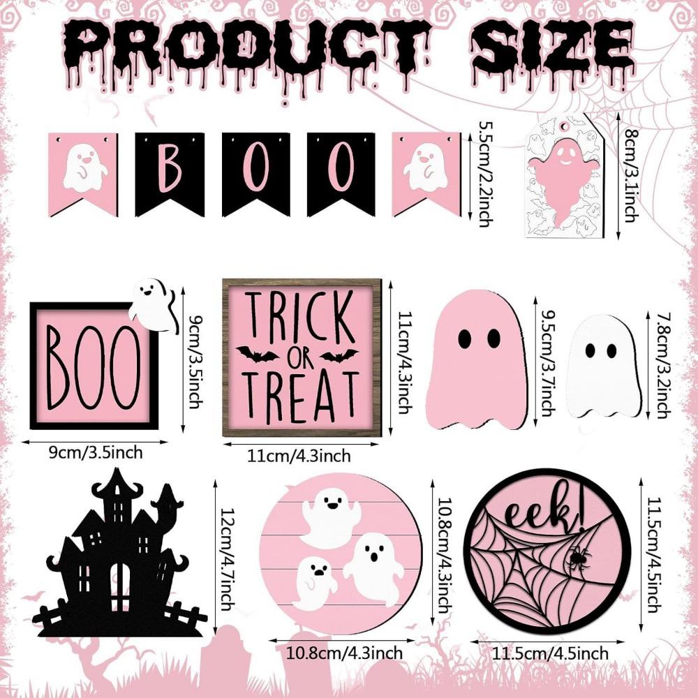 13pcs Wooden Signs Ornaments Cute Ghost Tray Decor Pink Halloween Pumpkin Layered Tray Decoration Set Decorative Funny