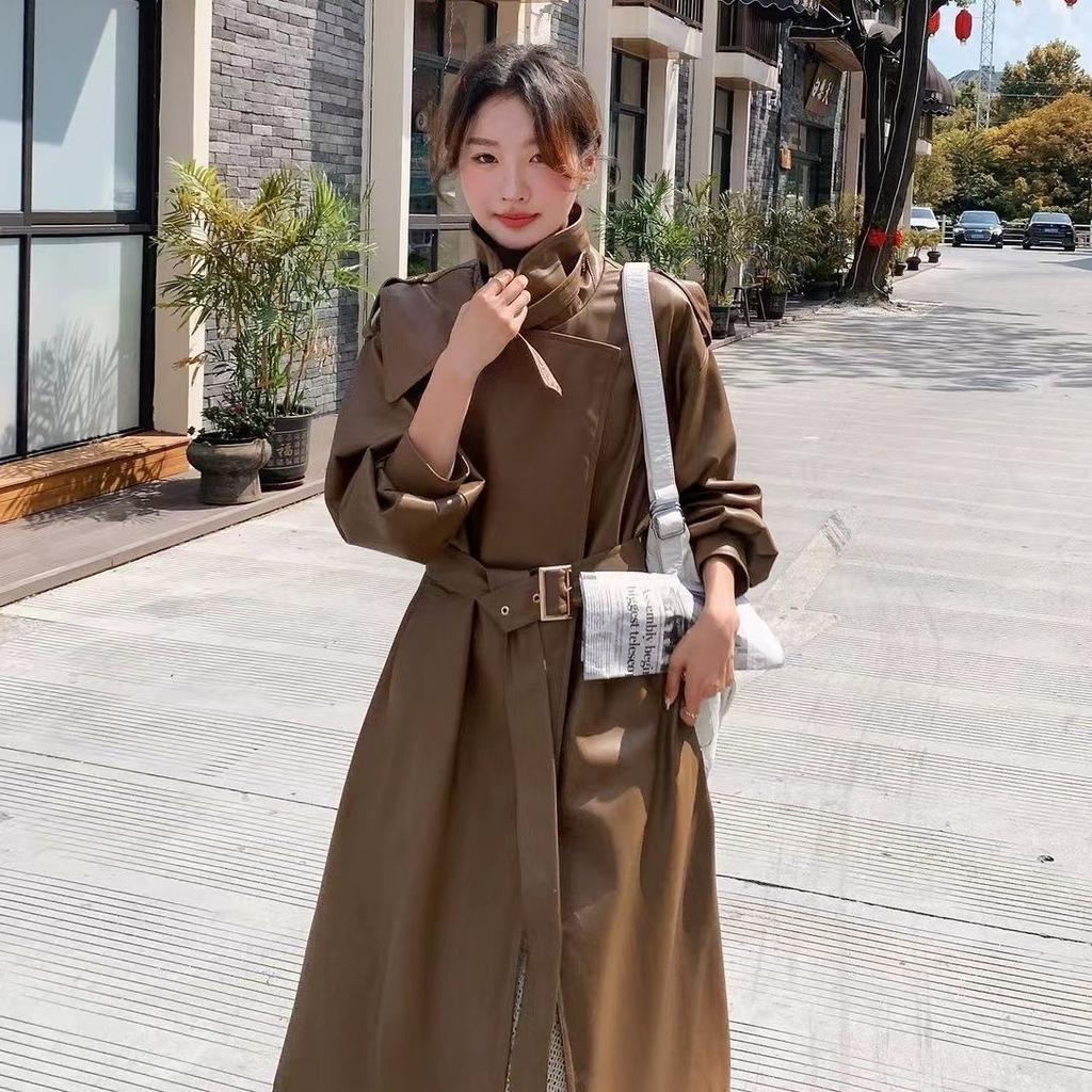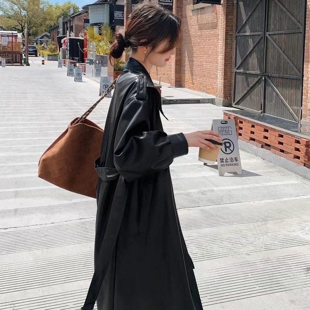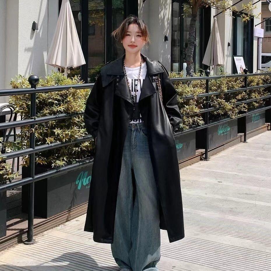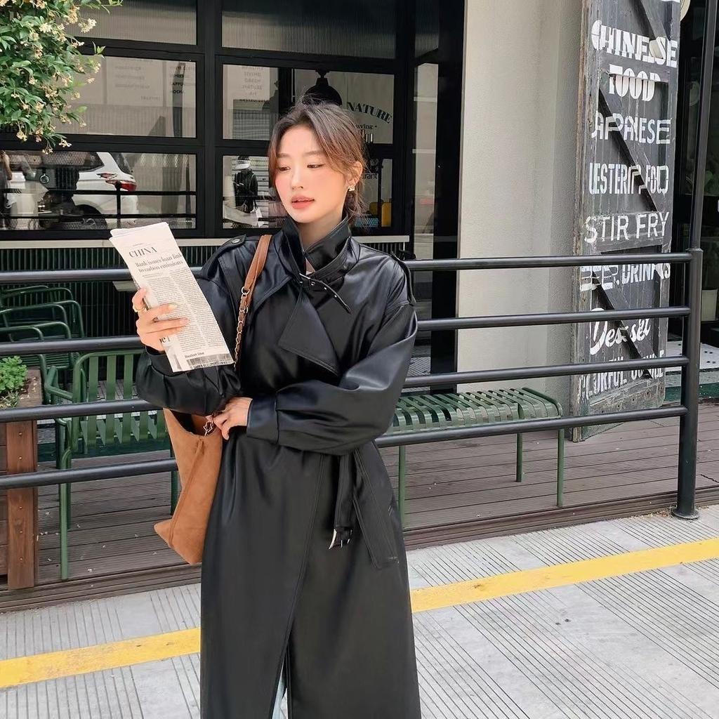 Новое осенне-зимнее пальто из искусственной кожи для женщин, длинная облегающая ветровка выше колена с поясом и пальто Temperament