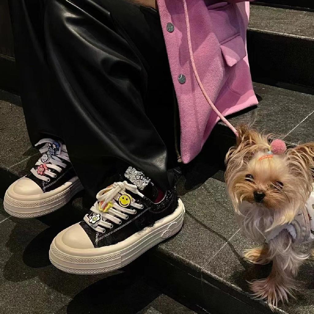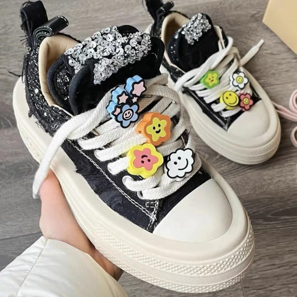 Весенне-осенние новые парусиновые туфли на толстой подошве, женская повседневная обувь с цветочным орнаментом и смайликом