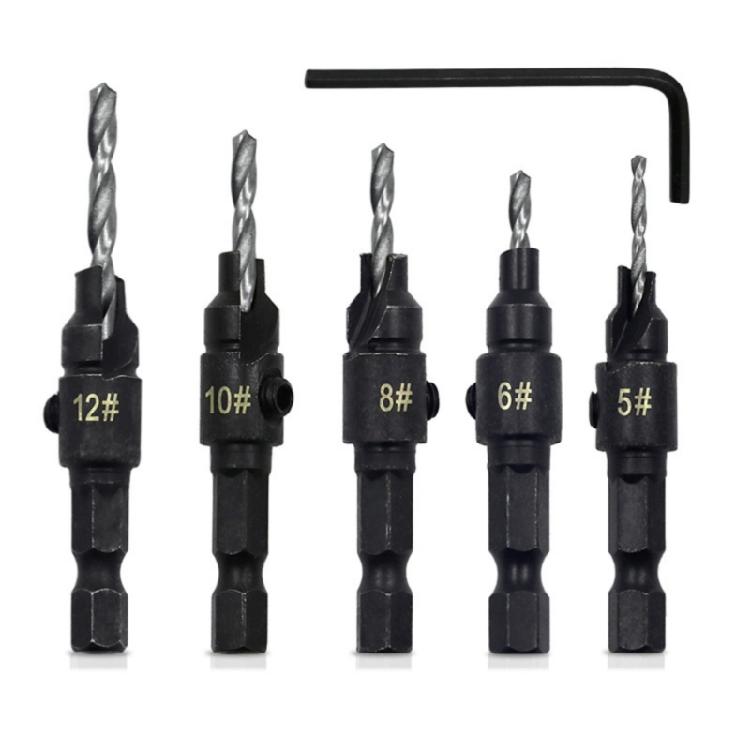 Woodworking Countersink Drill Kit Set of 5 1/4" Hexagonal Shank Bits for Combined Drilling and Chamfering Operations