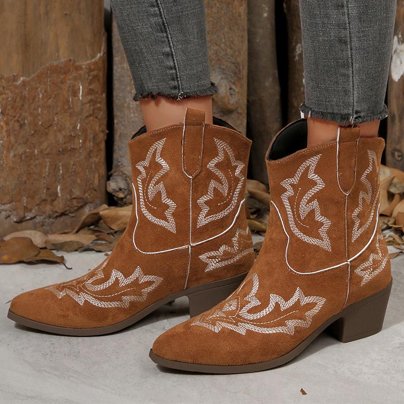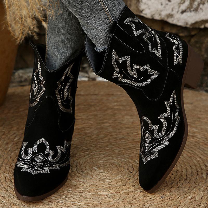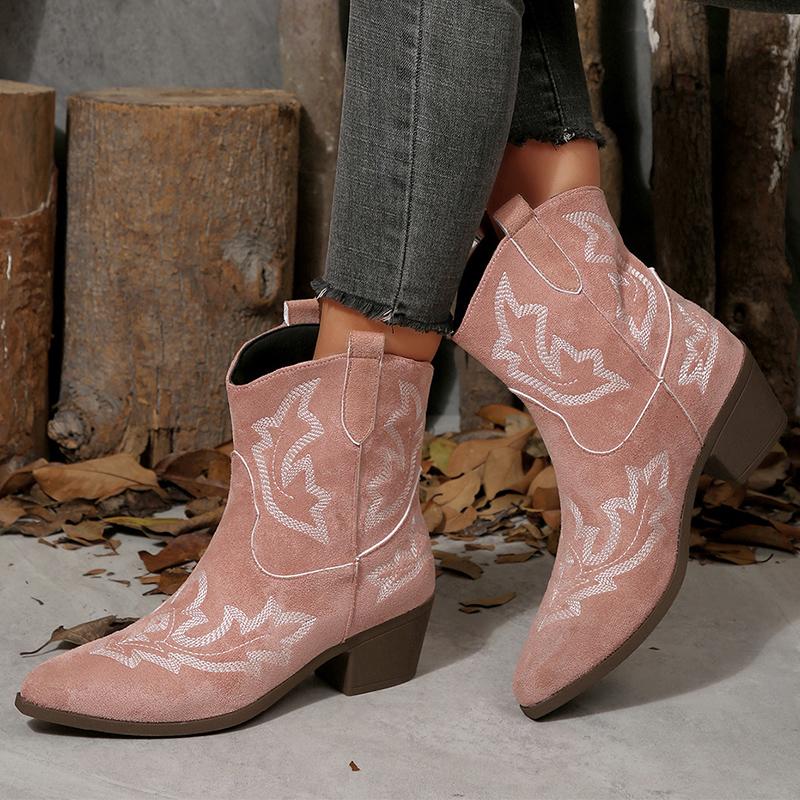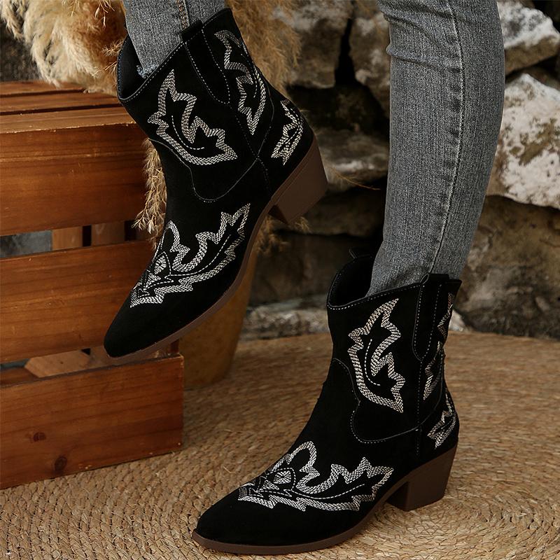Модные винтажные ботинки с вышивкой Женские 2025 Квадратный каблук Острый носок Ботильоны Женские Удобные ботильоны из искусственной замши Mujer