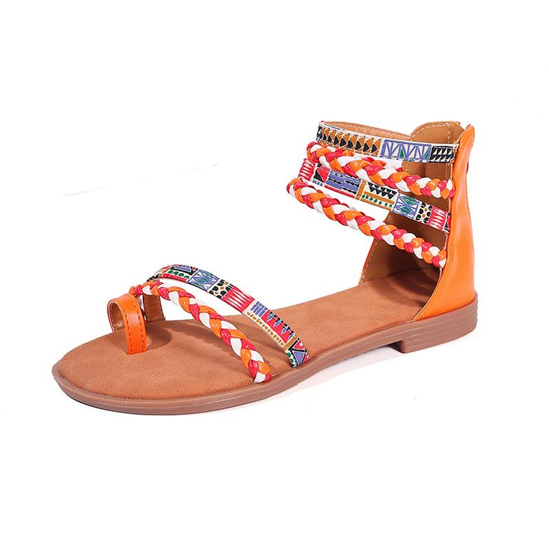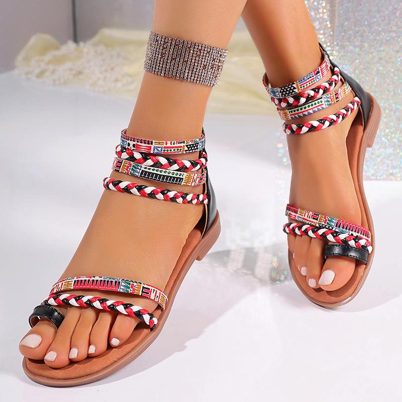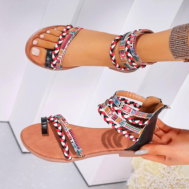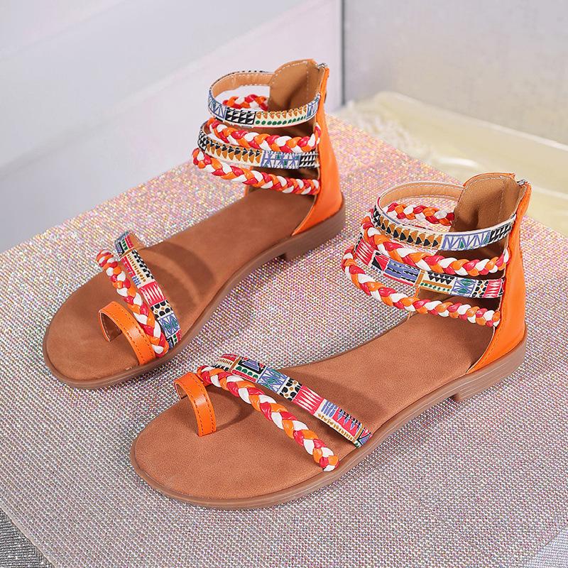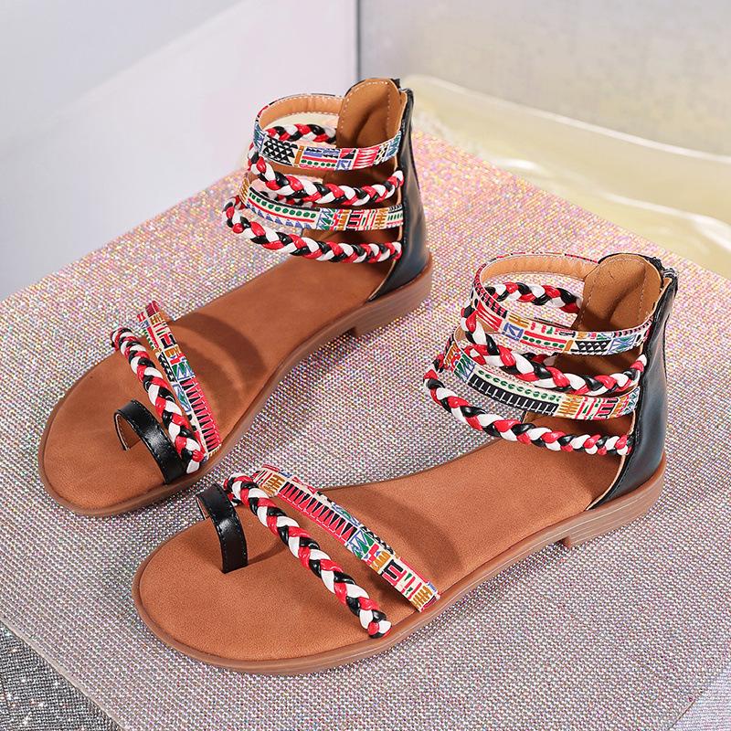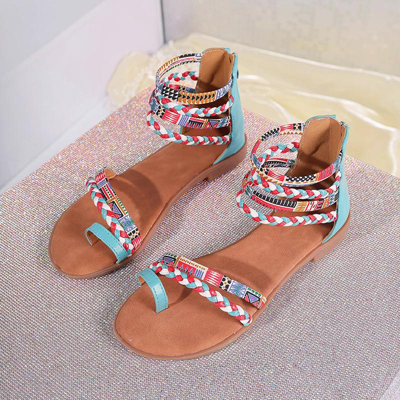Мода 2025 Женские Летние Модные Богемные Этнические Красочные Лоскутные Римские Сандалии на Плоской Подошве с Открытым Носком на Молнии Пляжная Обувь