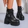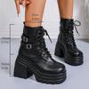 Мода Мода Пряжка Массивная Платформа Ботильоны Женские На Шнуровке Супер Высокий Каблук Панк Ботинки Женские Искусственная Кожа Толстый Каблук Мотоциклетные Боты