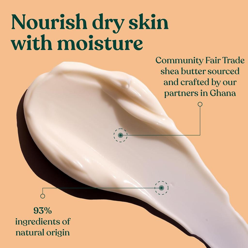 Vegan body lotion enriched with shea butter provides long-lasting comfort and intense moisture for dry skin