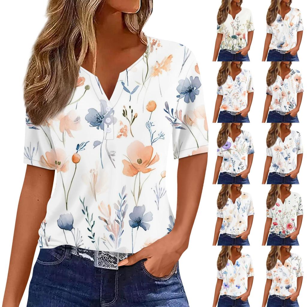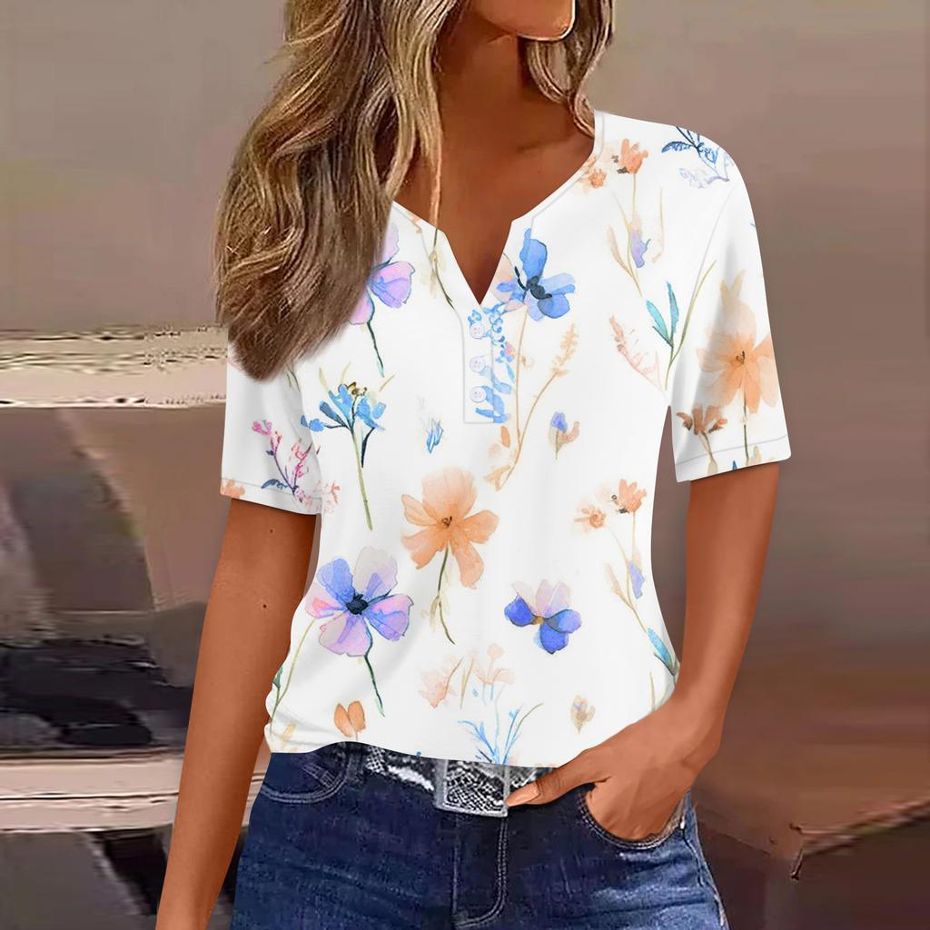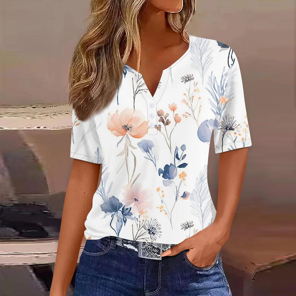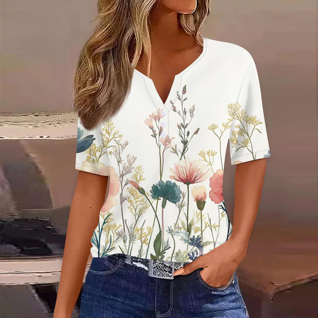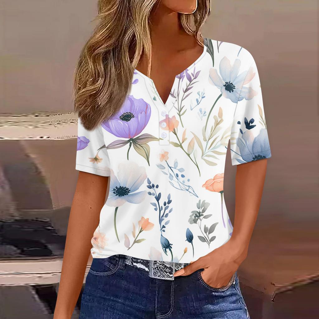 Жен. Футболка С принтом Пуговицы С короткими рукавами Повседневные Выходные Мода Классический Классический V-образный вырез Обычный Топ
