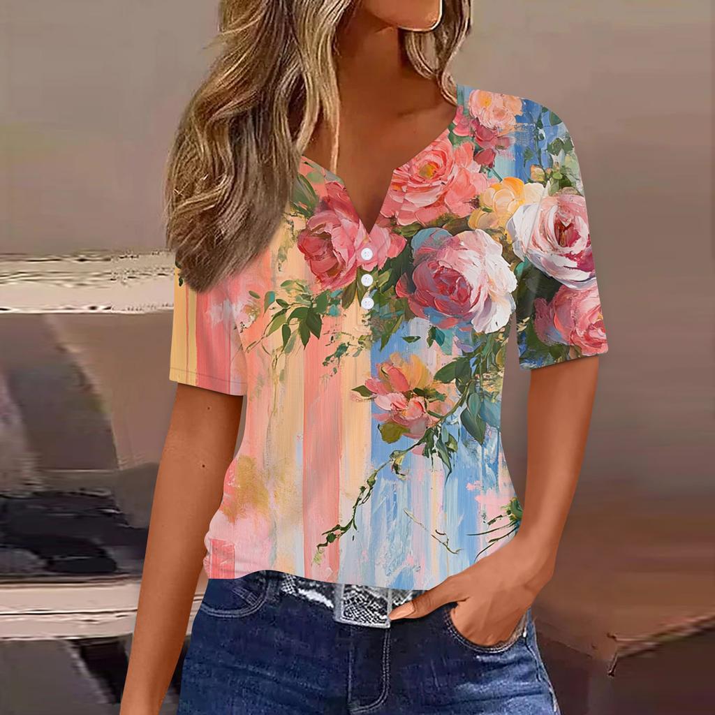 Жен. Футболка С принтом Пуговицы С короткими рукавами Повседневные Выходные Мода Классический Классический V-образный вырез Обычный Топ