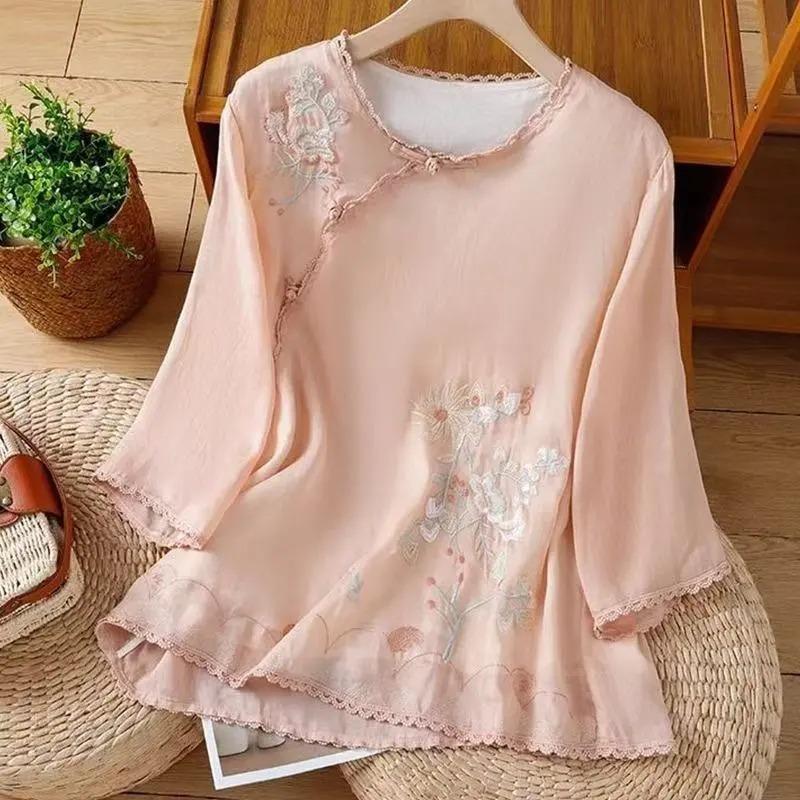 Женские рубашки в национальном стиле, литературные, ретро, с вышивкой, с рукавом три четверти, летние, на косых пуговицах, новые топы в стиле дзен