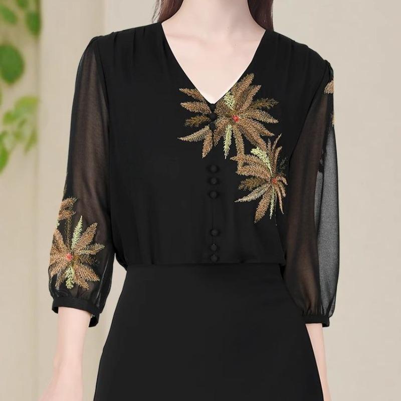 Шикарные вышитые весенне-летние свободные топы, модные повседневные рубашки с V-образным вырезом для женщин