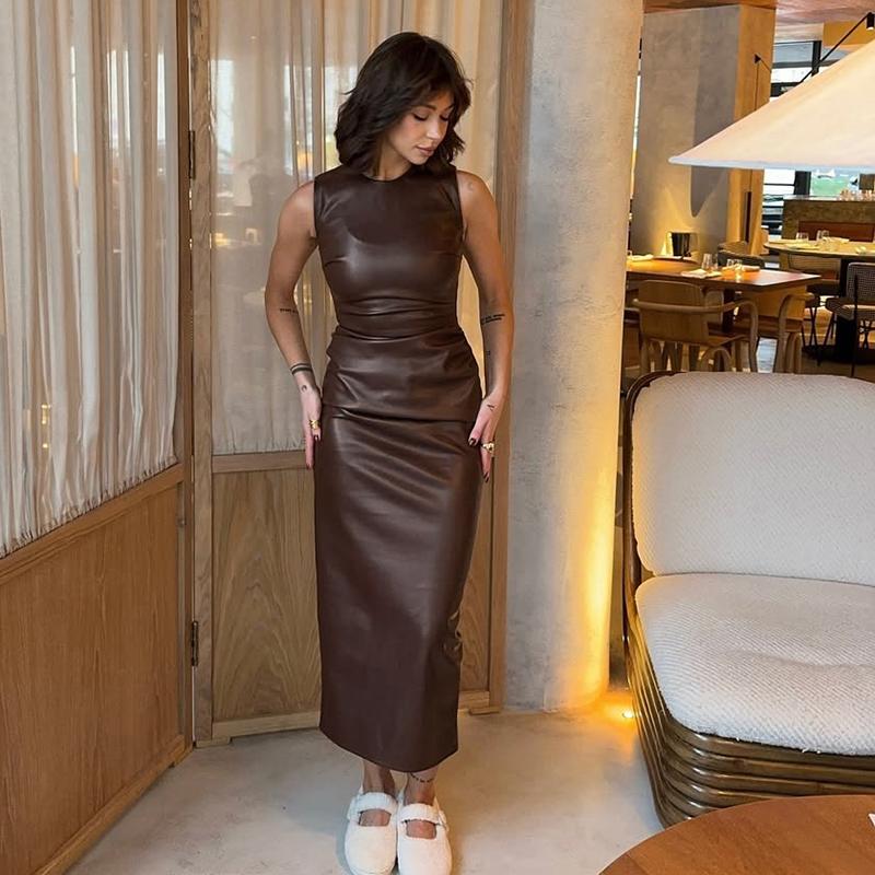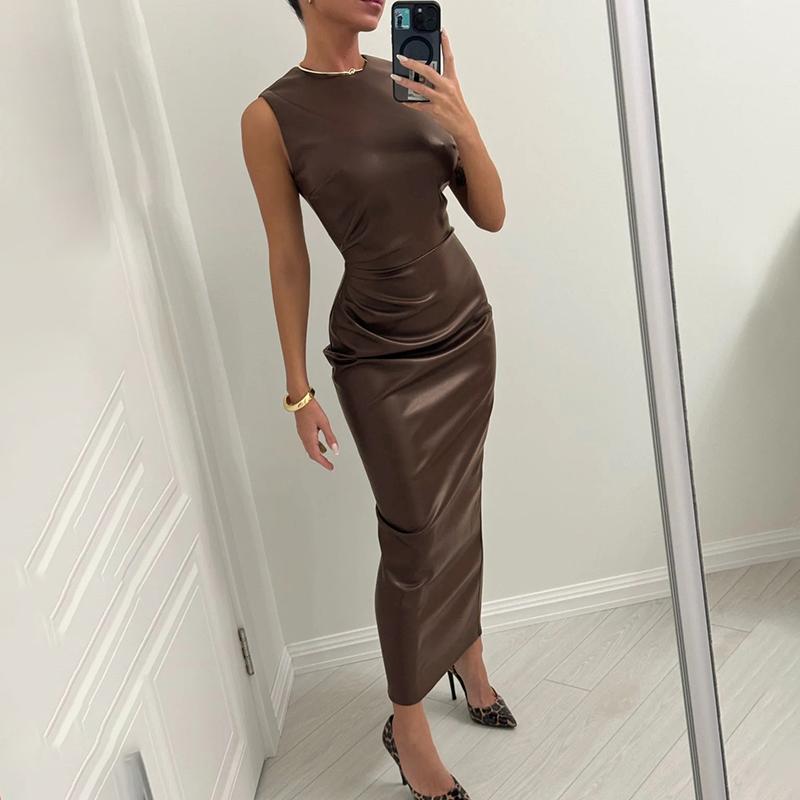 Платье из искусственной кожи облегает фигуру, идеально подчеркивая ее форму, демонстрируя большую часть женской сексуальности и очарования, с дизайном талии, подчеркивающим изгибы.