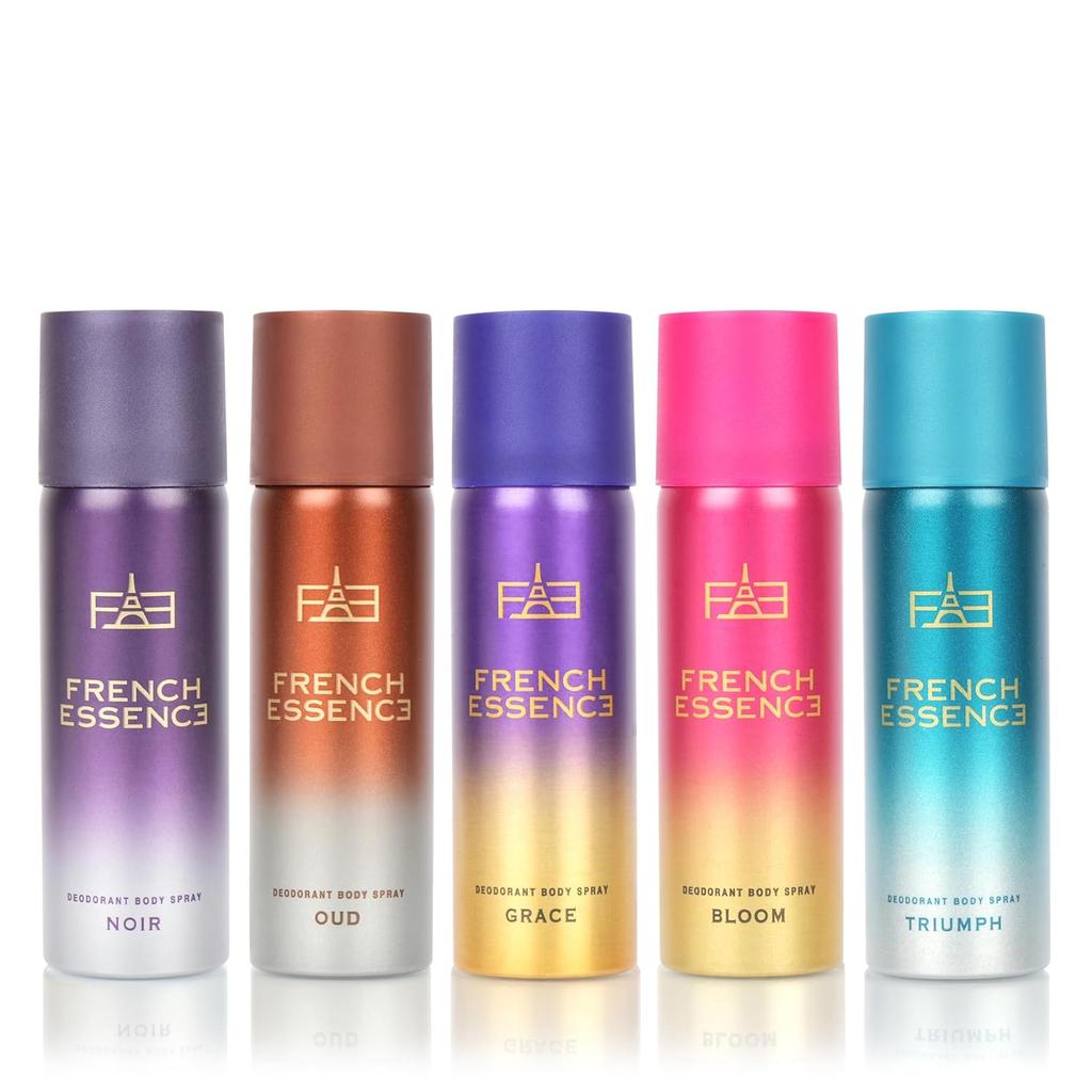 French Essence Deodorant Body Spray Combo For Men & Women Pack Of 5 X 50ml - 1.7 Fl.oz. Each | Noir+ Oud+ Grace+ Bloom+ Triumph Fragrance - Long Lasting Deo For Unisex | Perfect For Daily Use