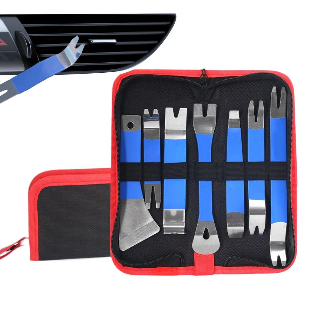 This automotive trim removal tool set is for mechanics and installers working on vehicle interiors and exteriors. It includes pry tools designed to safely remove door panels, window trims, upholstery, and audio components. Ideal for detailing and repair tasks, this versatile 1-set kit also assists with baseboard work. construction ensures reliable performance during automotive projects without causing damage.