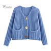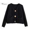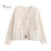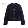 Вязаный укороченный кардиган, свитер с V-образным вырезом, длинным рукавом, на пуговицах, свободный крой, свитер, пальто с карманами, однотонный трикотаж
