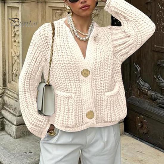 Вязаный укороченный кардиган, свитер с V-образным вырезом, длинным рукавом, на пуговицах, свободный крой, свитер, пальто с карманами, однотонный трикотаж — купить товар онлайн с бесплатной доставкой по всему миру!