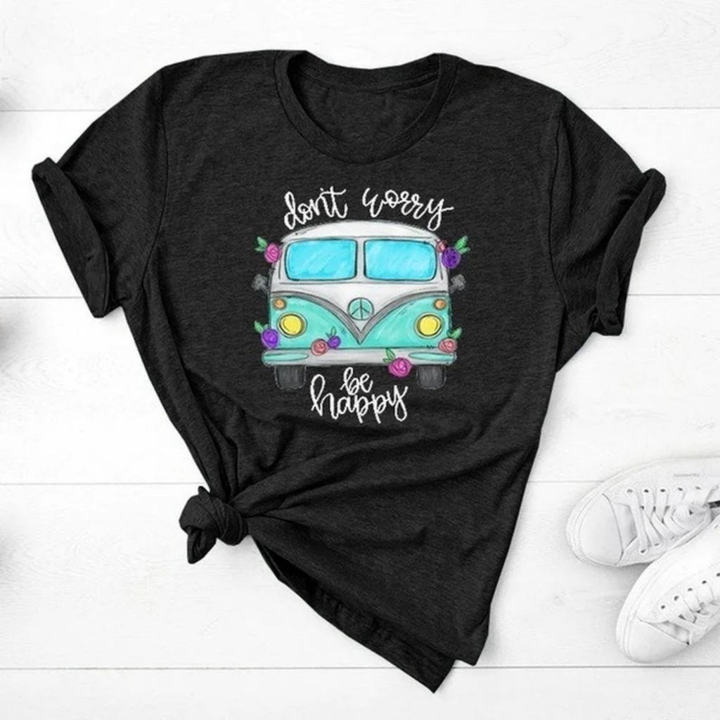 Футболка с принтом автобуса Be Happy, женская, с коротким рукавом, с круглым вырезом, свободная, летняя, женская, футболка, топы, Camisetas Mujer — купить товар онлайн с бесплатной доставкой по всему миру!