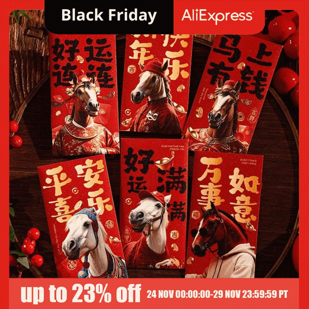 6pcs Chinese 2026 New Year Red Envelope Glitter Frosted Bronzing Horse Year Money Envelope Traditional Thickened
