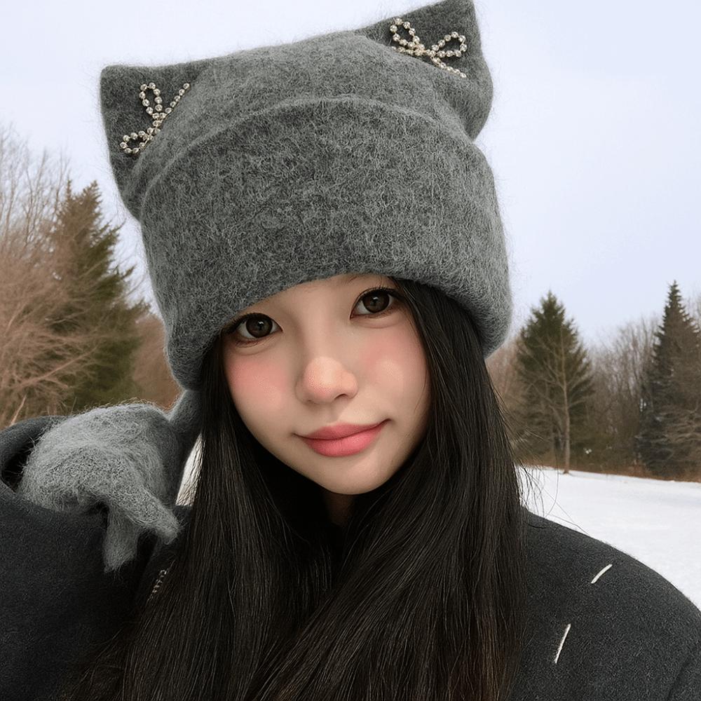 Bow Knitted Pullover Hat Sweet Cool Winter Wool Hat Windproof Cat Ears Beanie Hat Winter