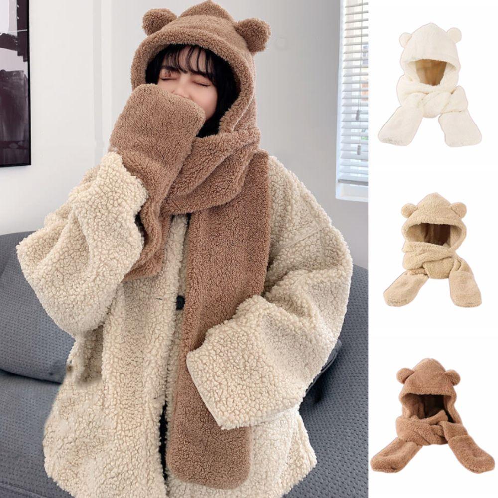 3 in 1 Plush Scarf Hat Gloves Thickened Fleece Scarves Hat Cute Bear Ear Plush Beanie Girl