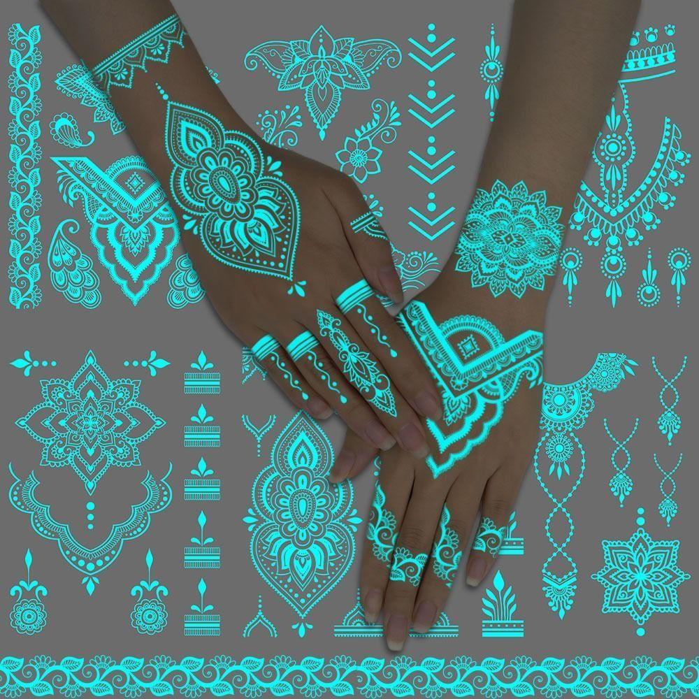 6 Sheets Lasting Henna Tattoo Stickers Blue Luminous Lace Fake Tattoos Hand Finger