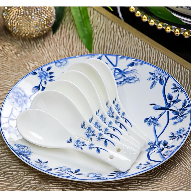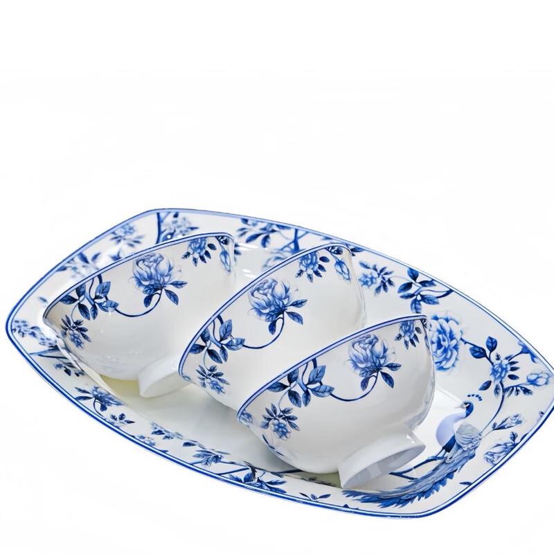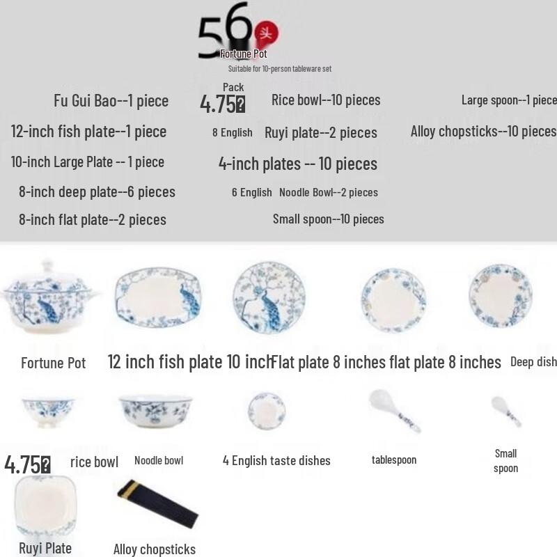 Набор столовой посуды из костяного фарфора Wutuo "Голубой павлин", 56 предметов