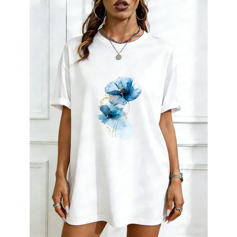 Oversized T Shirt Dress Black Blue Floral Print For Casual Wear — купить товар онлайн с бесплатной доставкой по всему миру!