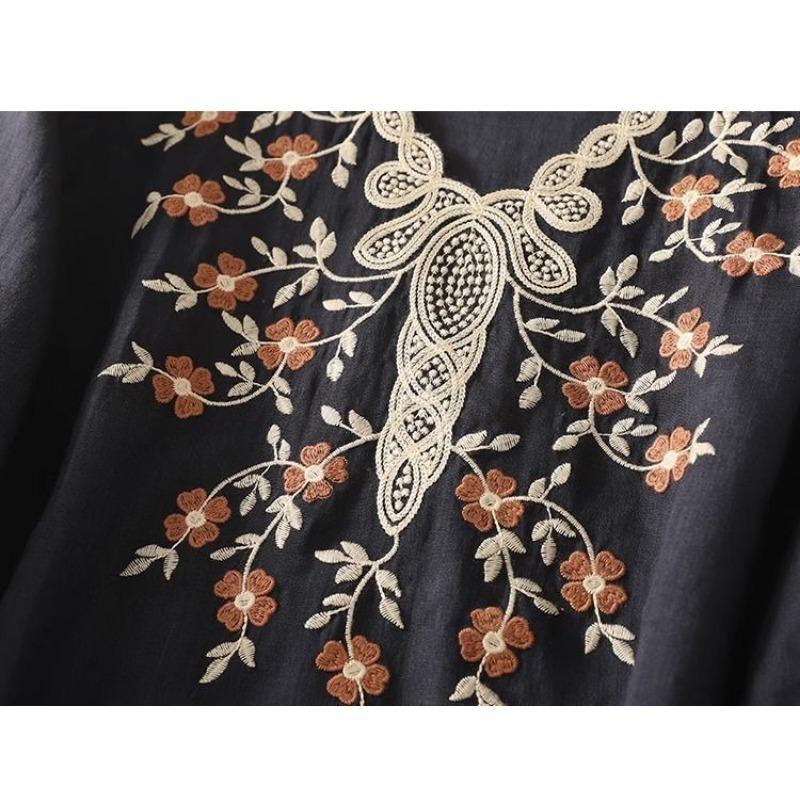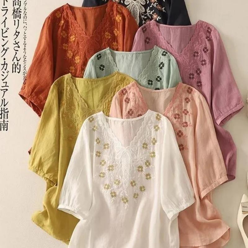 Новый стиль Хлопково-льняная рубашка с вышивкой Женственное кружево V-образный вырез Рукав средней длины Пуловер
