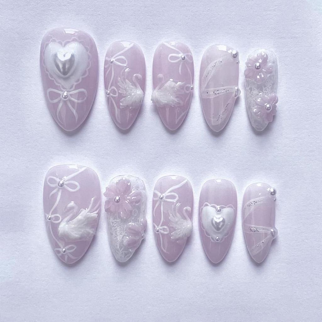 Элегантные 3D накладные ногти 'Белый лебедь' с дизайном 'Сердечко и бантик' - Короткие миндалевидные типсы