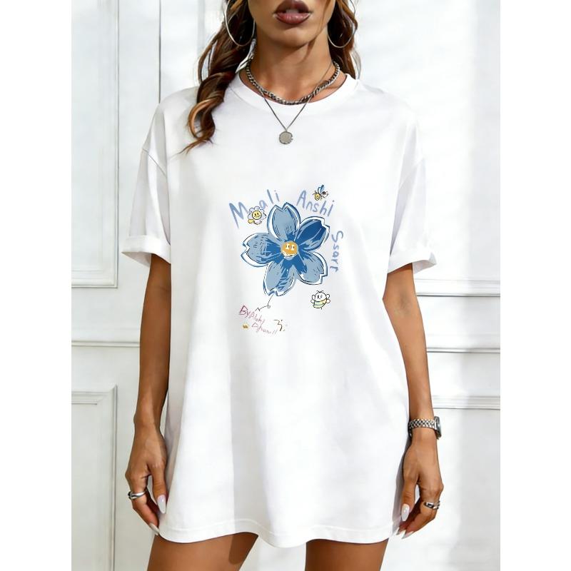 Платье-футболка оверсайз черного и синего цвета с цветочным принтом и надписями, повседневная уличная одежда для женщин