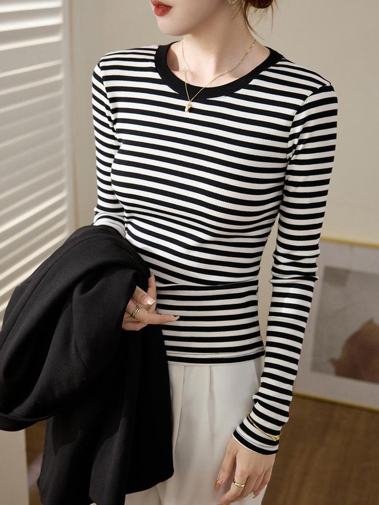 Окунитесь в стиль и комфорт с этой женской приталенной футболкой с длинным рукавом в черно-белую полоску, идеальной для сезона Осень/Зима 2025.. Этот топ, изготовленный из мягкого высококачественного хлопка, обеспечивает уютную посадку, идеально подходящую для прохладной погоды.. Классический черно-белый полосатый узор добавляет вневременной штрих, а длинные рукава и круглый вырез создают лестный силуэт.. Эта универсальная футболка — шикарное дополнение к любому гардеробу, предлагающее бесконечные возможности для стилизации в повседневном или нарядном образе.