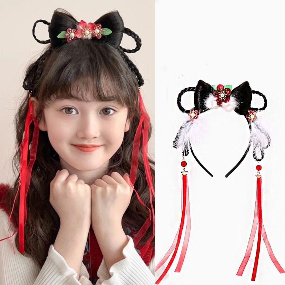 Tassel Children Wig Headband Flower New Year Hair Accessories Hanfu Headwear Year of the Horse