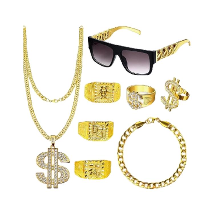 Hip Hop Costume Kit 80s 90s Cosplay Outfit Jewelry Cool Rapper Accessories for Women Men Gold Chain Sunglasses Rings — купить товар онлайн с бесплатной доставкой по всему миру!