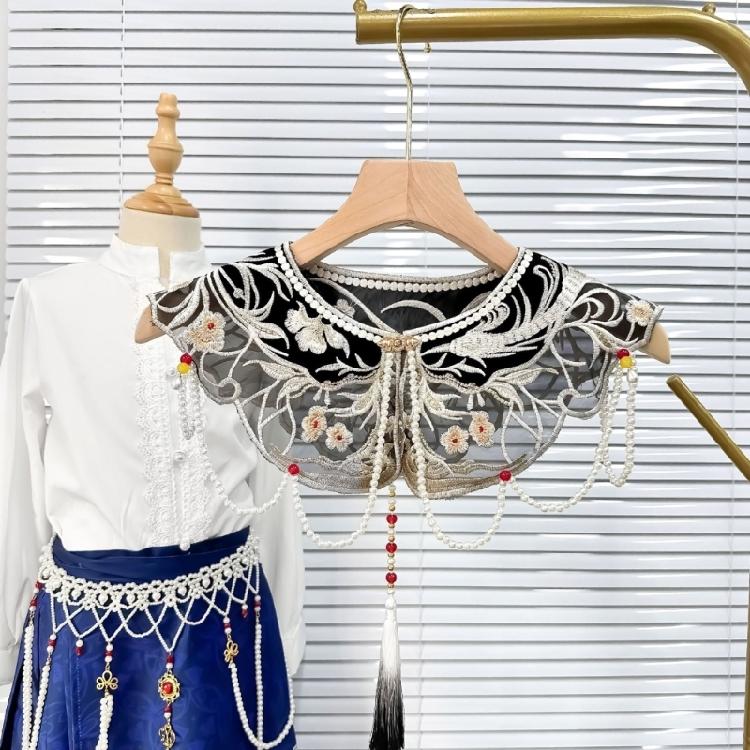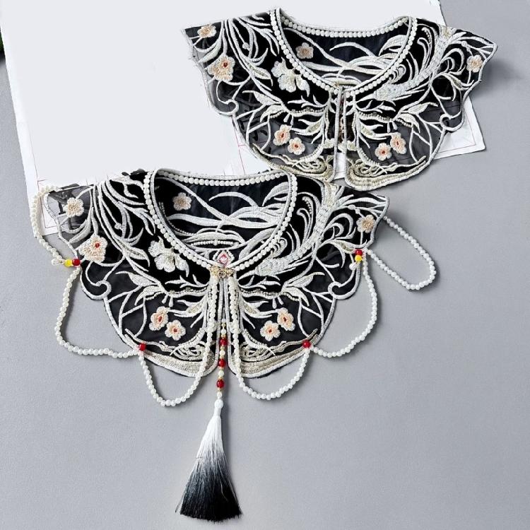 Модный съемный ложный воротник с вышивкой, аксессуар для шеи, винтажная жемчужная цепочка, кисточки, черная шаль-накидка для платья