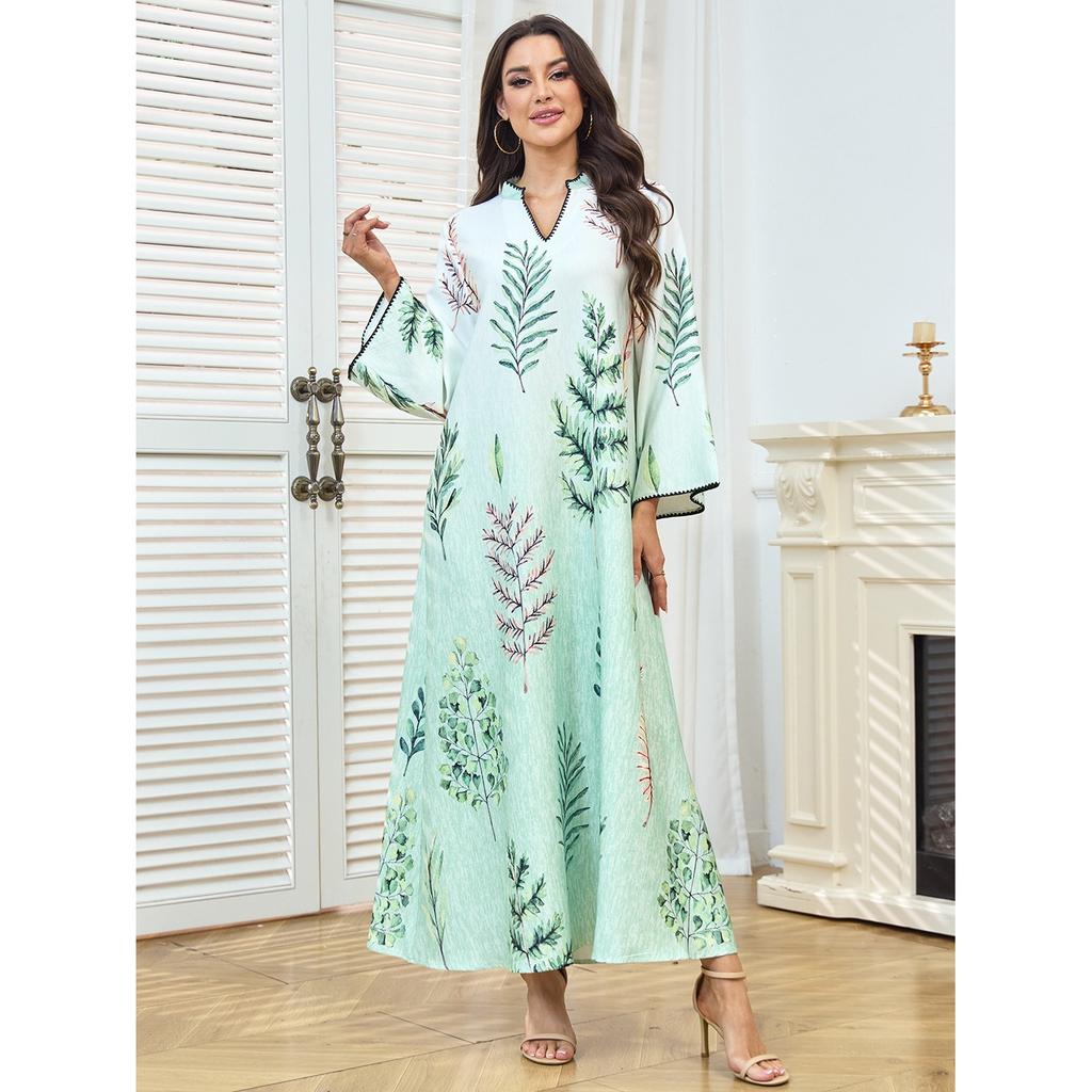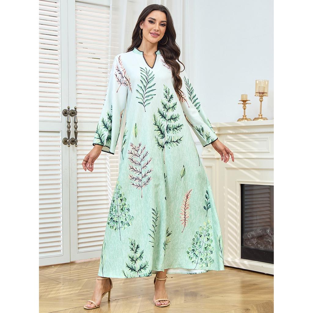 kpoooopstar Women's Casual Maxi Dress - Light Green Plant Print Arabian Style